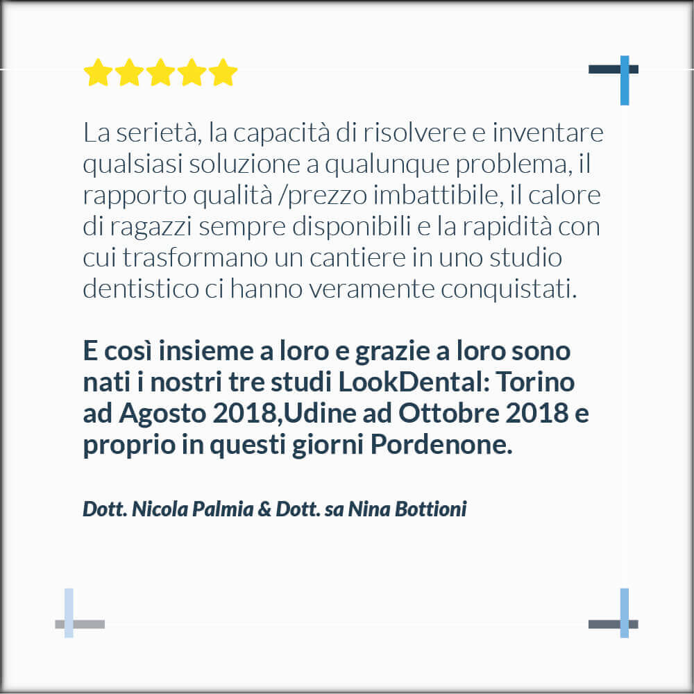 La serietà, la capacità di risolvere e inventare qualsiasi soluzione a qualunque problema, il rapporto qualità /prezzo imbattibile, il calore di ragazzi sempre disponibili e la rapidità con cui trasformano un cantiere in uno studio dentistico ci hanno veramente conquistati.