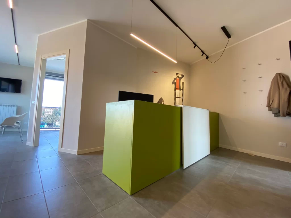 Particolare attenzione è stata dedicata alla scelta dei riuniti odontoiatrici, con tappezzeria personalizzata per offrire il massimo comfort ai pazienti e un tocco distintivo all’ambiente.