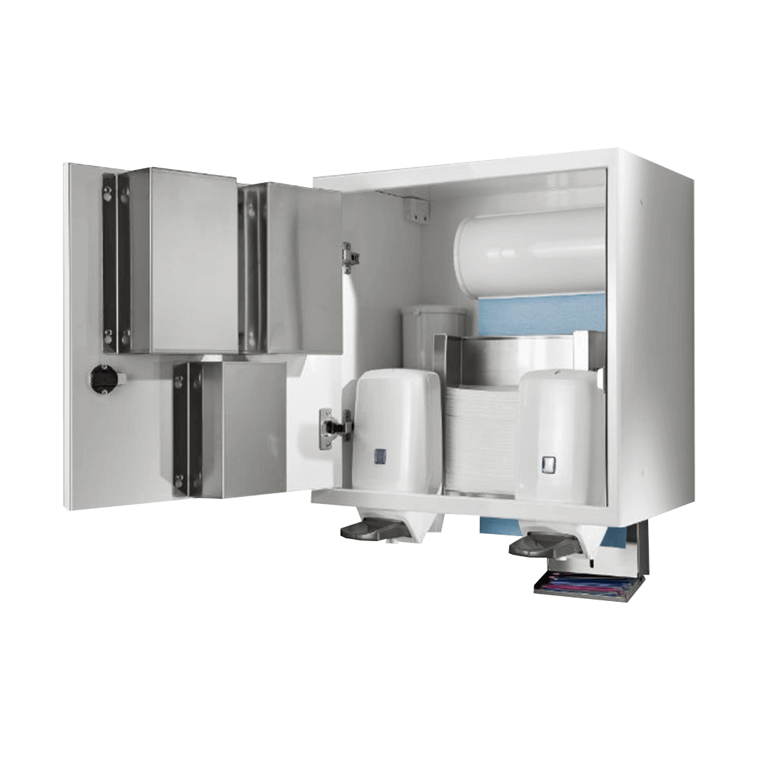 - completa di contenitori per guanti, mascherine, salviette a C, porta bicchieri, porta rotolo mantelline, porta cannule aspira saliva e 2 dosatori a gomito/manuali per disinfettante e detergente;