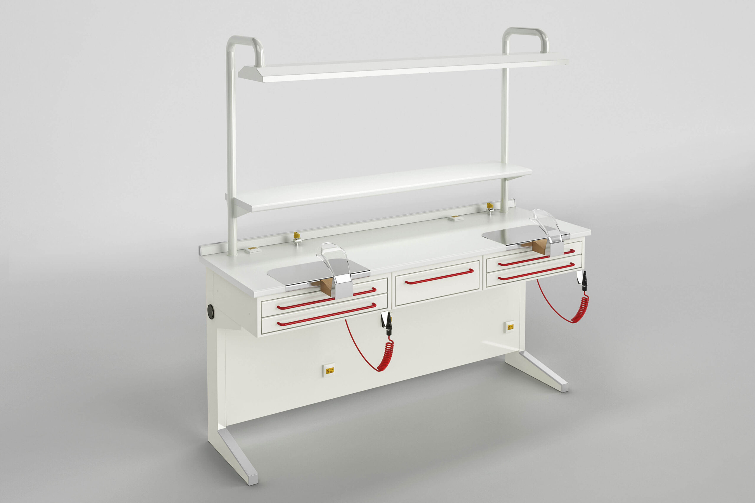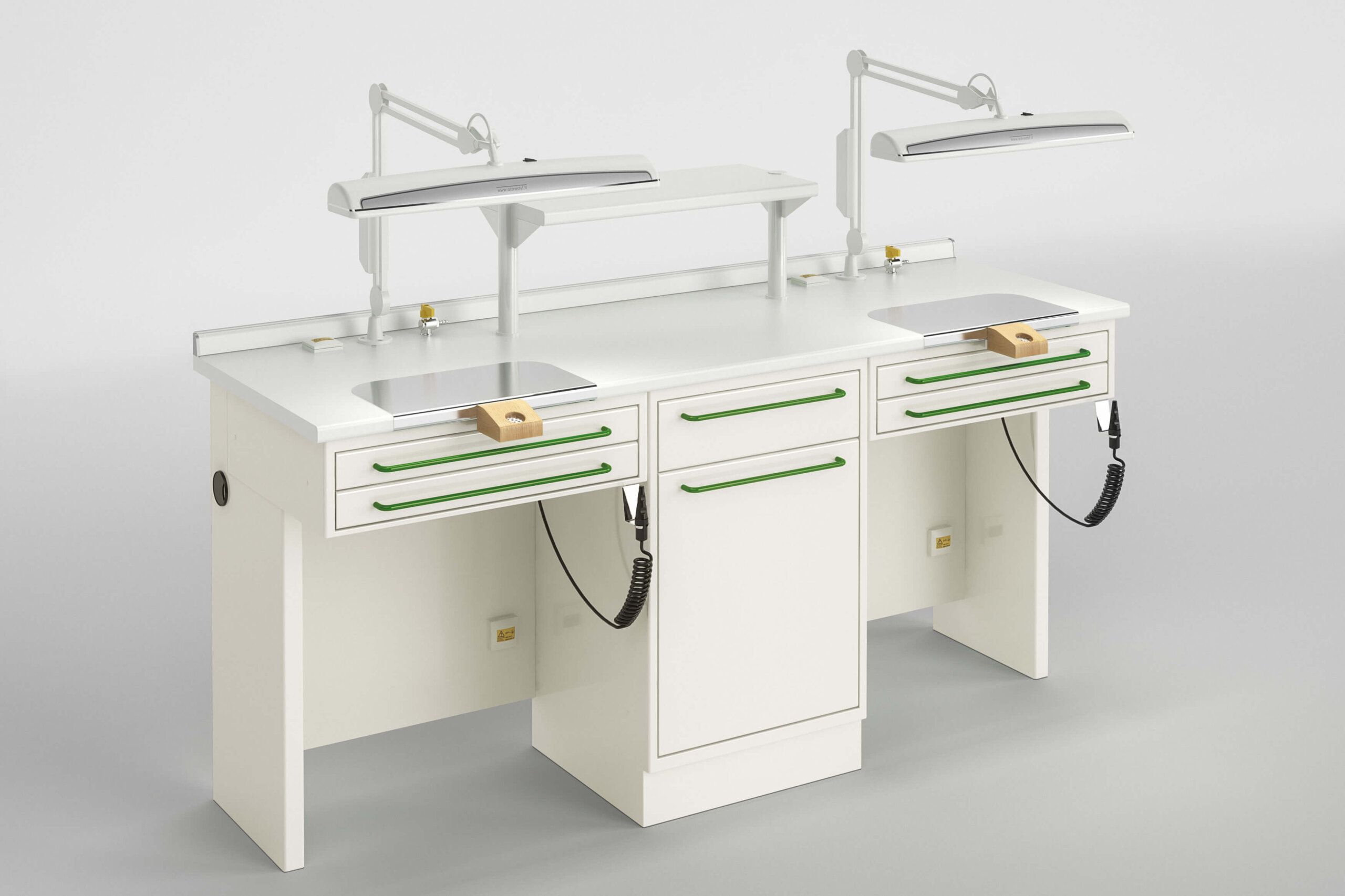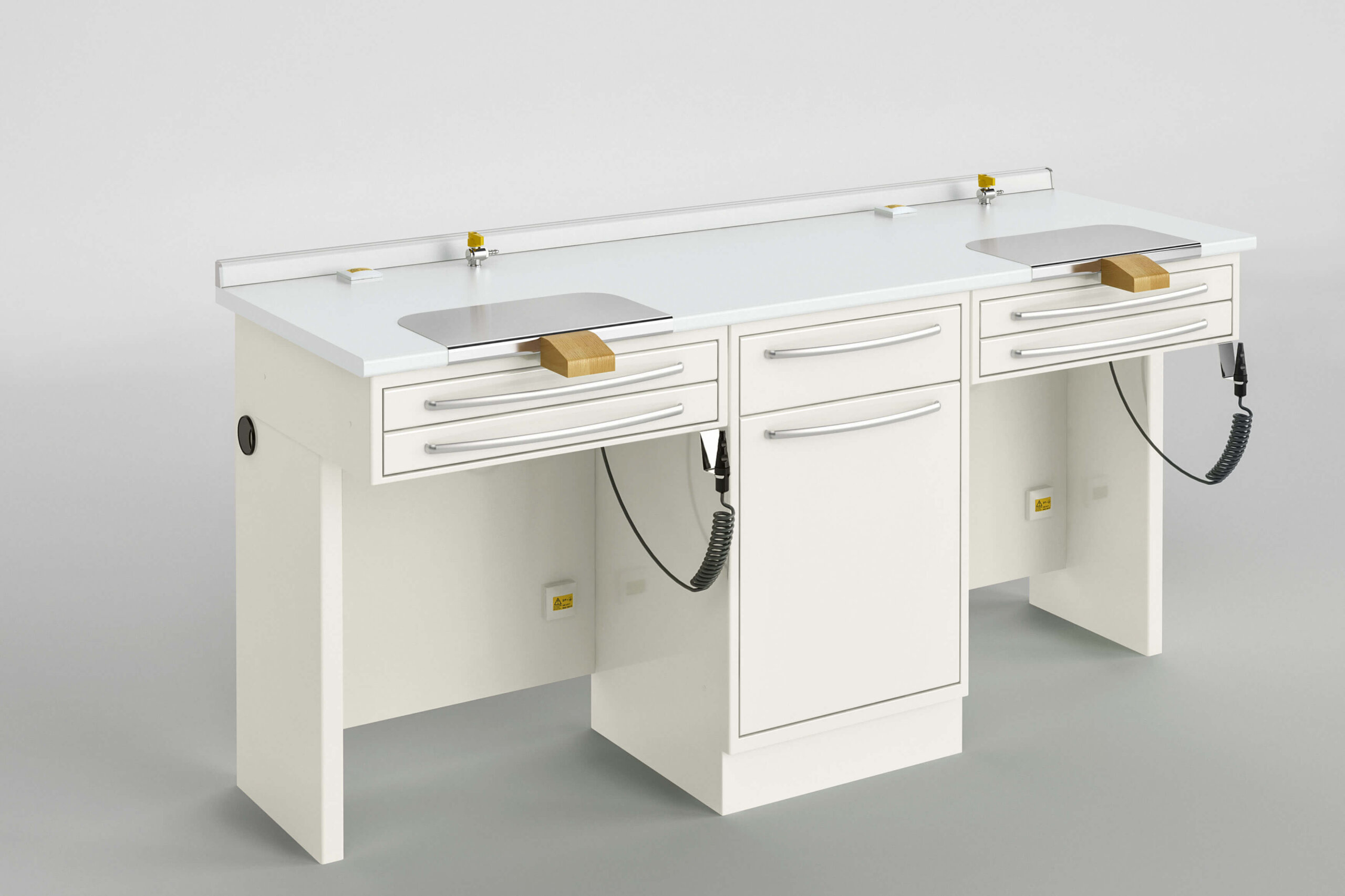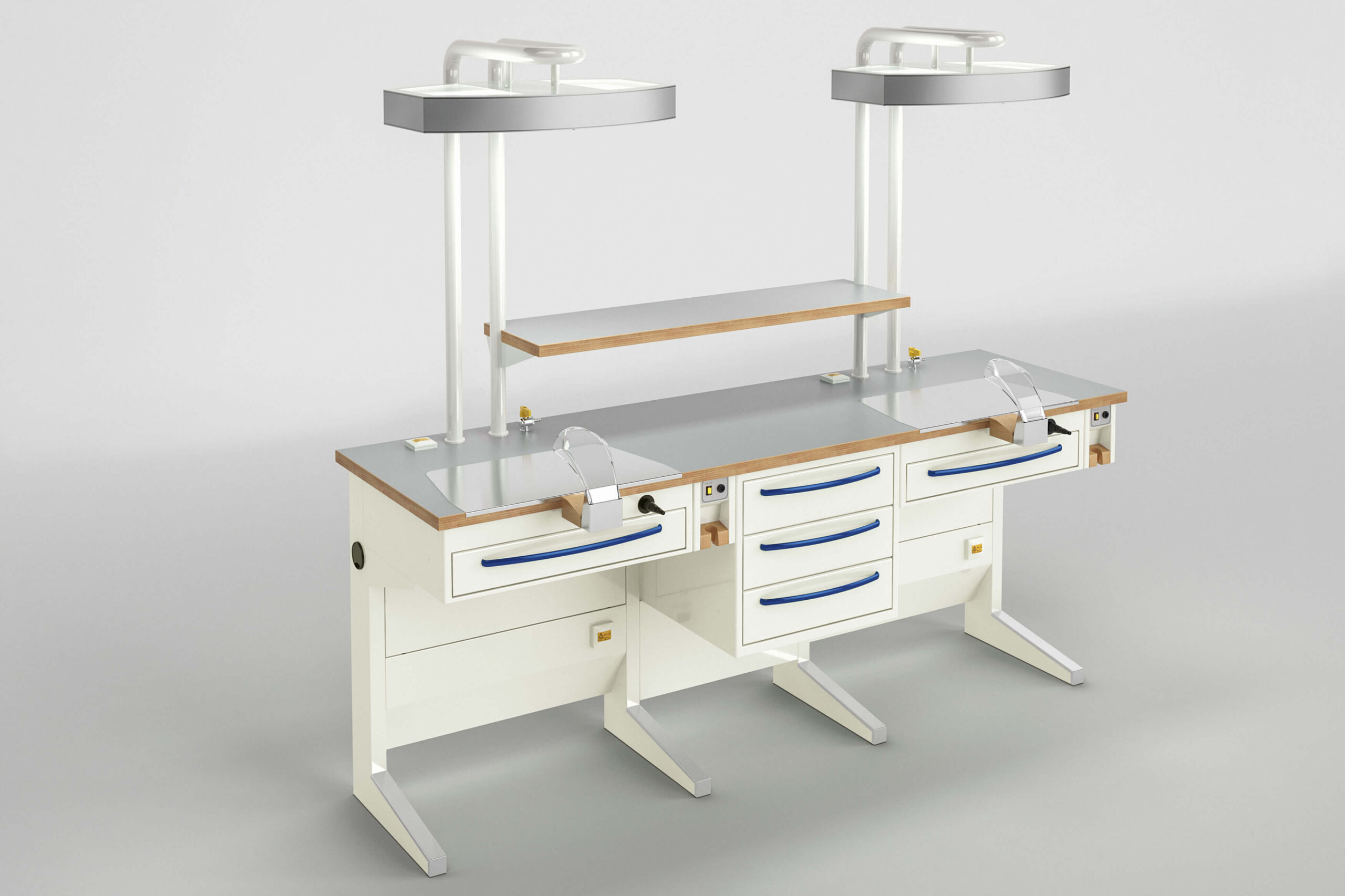 Mobile da laboratorio a due postazioni. Completi di siringa ad aria, zeppa in faggio aperta, proteggi piano in inox.